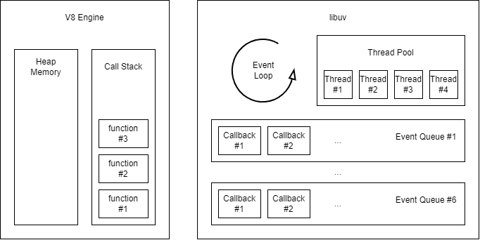 libuv는 효율적인 비동기 처리를 위해 Queue를 6개로 세분화하였다. Event Loop는 이 6개의 Queue를 순차적으로 검사하면서 callback을 Call Stack으로 이동시킨다.