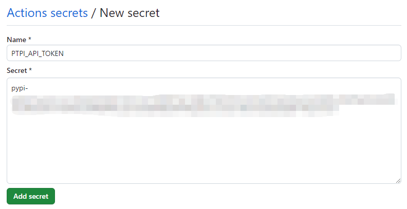 환경변수의 이름(PYPI_API_TOKEN)을 짓고 위에서 복사해둔 pypi api token을 붙여넣은 후 Add secret을 클릭한다.