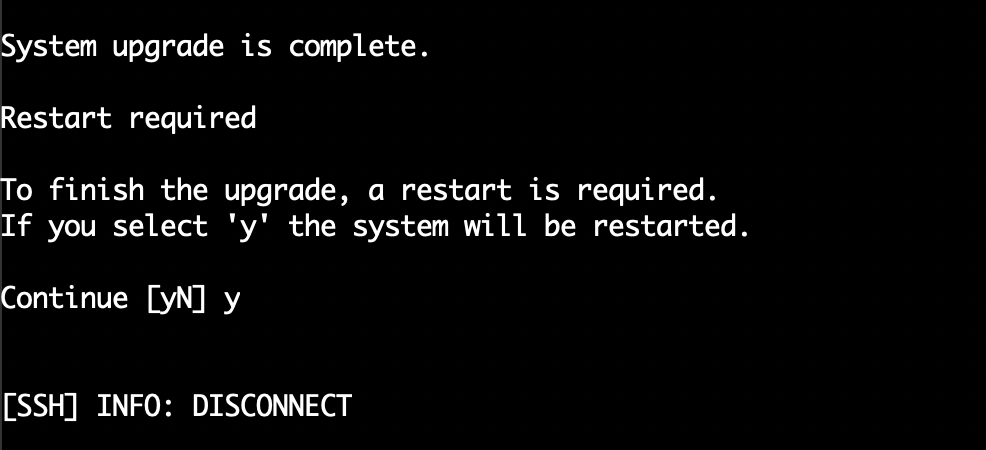업그레이드 스크립트가 모두 종료되었으면 재부팅 할 것인지 물어본다. y를 입력하여 재부팅을 승인하고 다시 쉘에 접속한다.